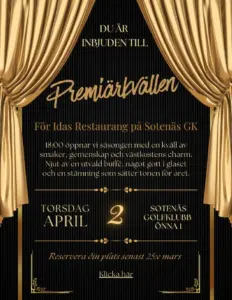 Premiärkväll!18 mars 2026/0 Kommentarer/i Okategoriserade/av kc@sotenasgolf.se Premiärkväll! Nu är det äntligen dags för vår premiärkväll och du är varmt välkommen att vara med. Det kommer bli en härlig kväll med trevligt sällskap och spännande upplevelser. Vill du vara med? Anmäl dig via länken nedan https://www.idasrestaurang.se/premiarkvall https://sotenasgolf.se/wp-content/uploads/2026/03/697f377b634c66798ece360a_Sotenas-och-Mjolkerod-2800-1400-5-scaled.png 1280 2560 kc@sotenasgolf.se https://sotenasgolf.se/wp-content/uploads/2025/08/Sotenas-Golfklubb-1-2-300x209.png kc@sotenasgolf.se2026-03-18 13:02:242026-03-18 13:02:24Premiärkväll!